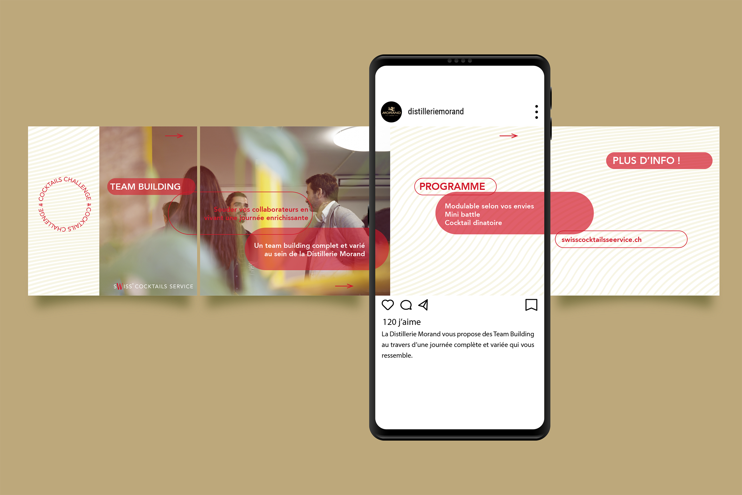 L’objectif de la campagne: création d’une communication pour promouvoir les prestations de services que propose Swiss Cocktail Service by Morand. Cette branche de l’entreprise propose différentes activités: cours cocktails, EVJF, visite, team building, traiteur mini cocktails. La campagne se développe sous forme de contenu pour les réseaux sociaux.